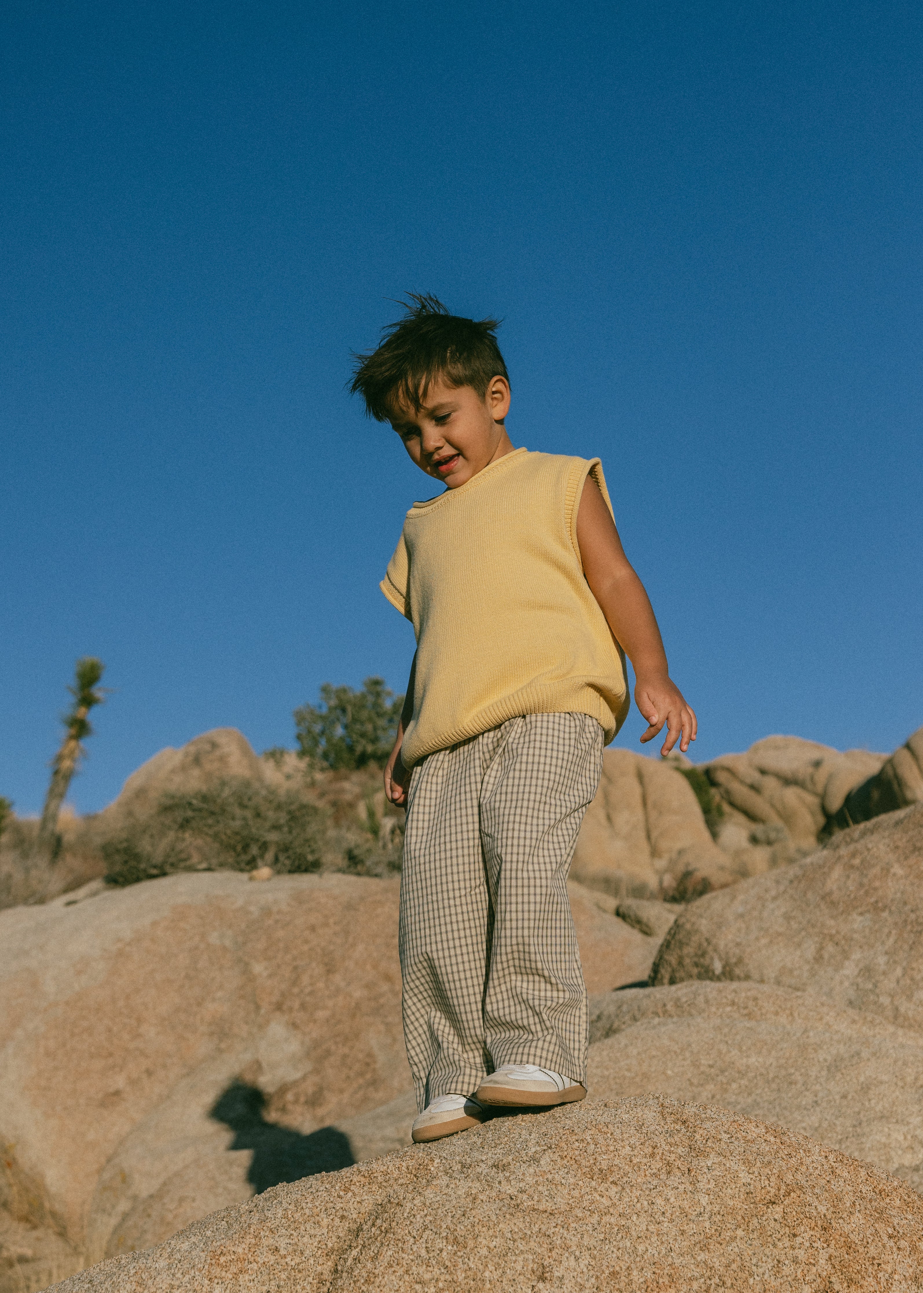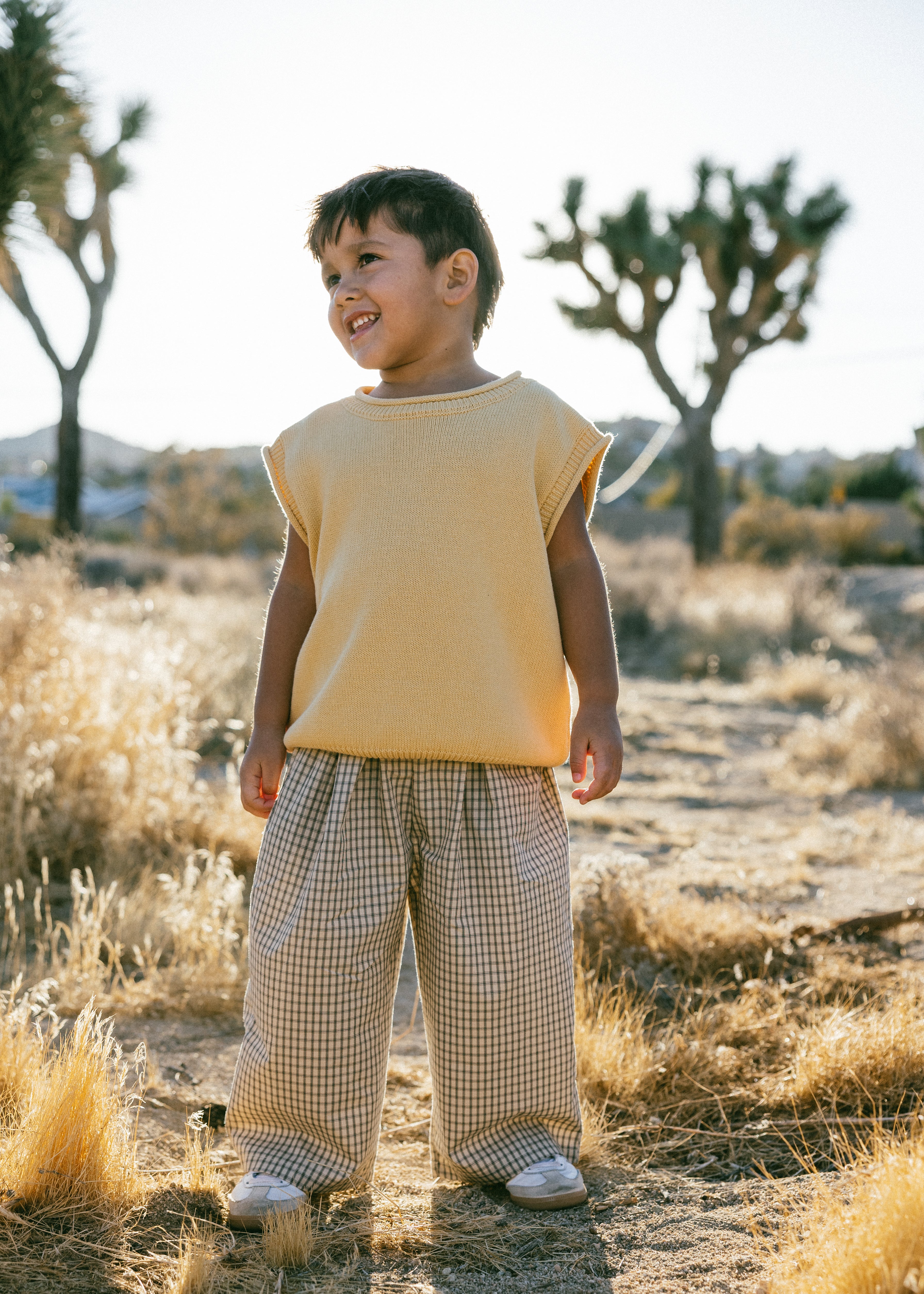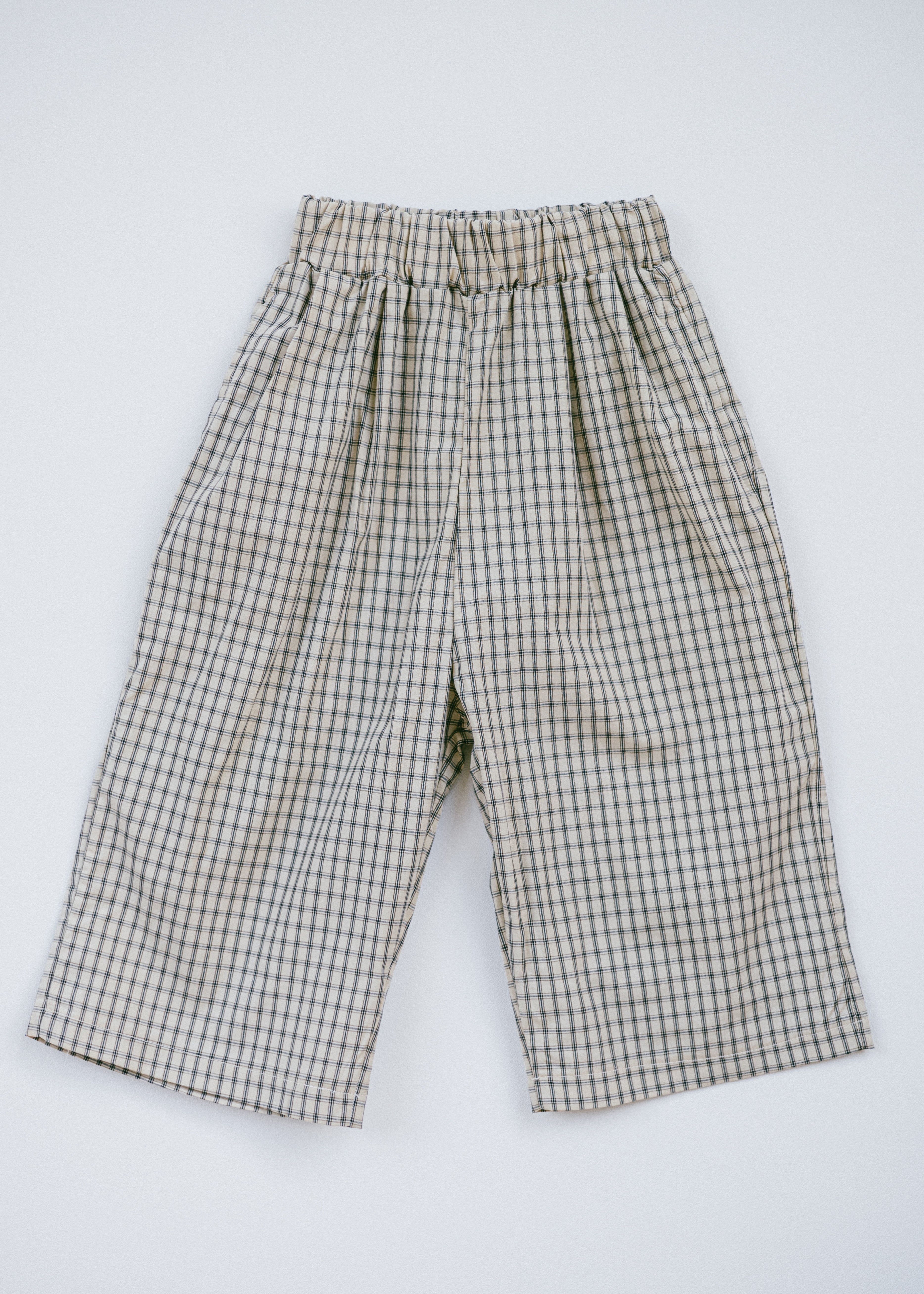 • Cream pants with brown and navy grid pattern