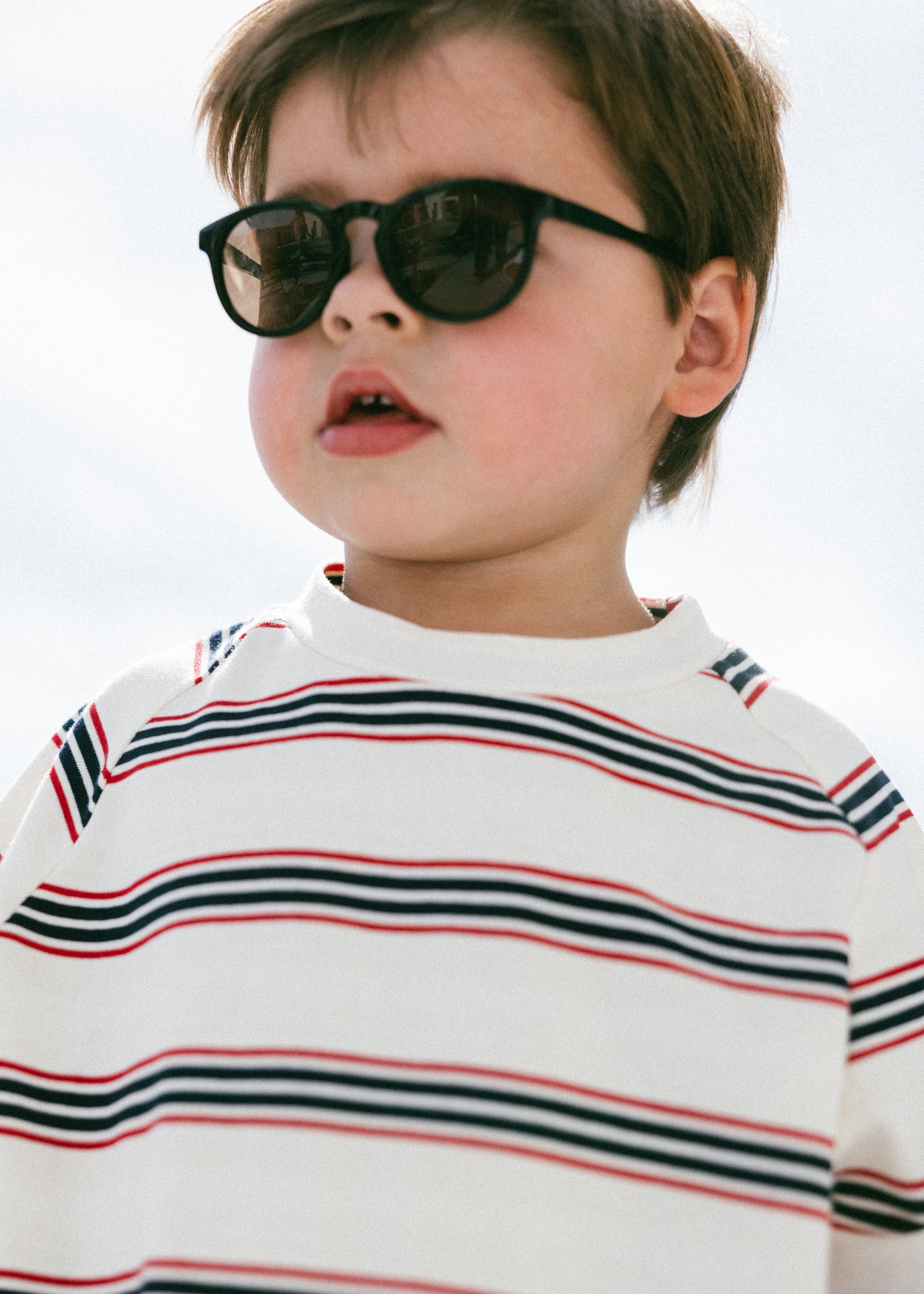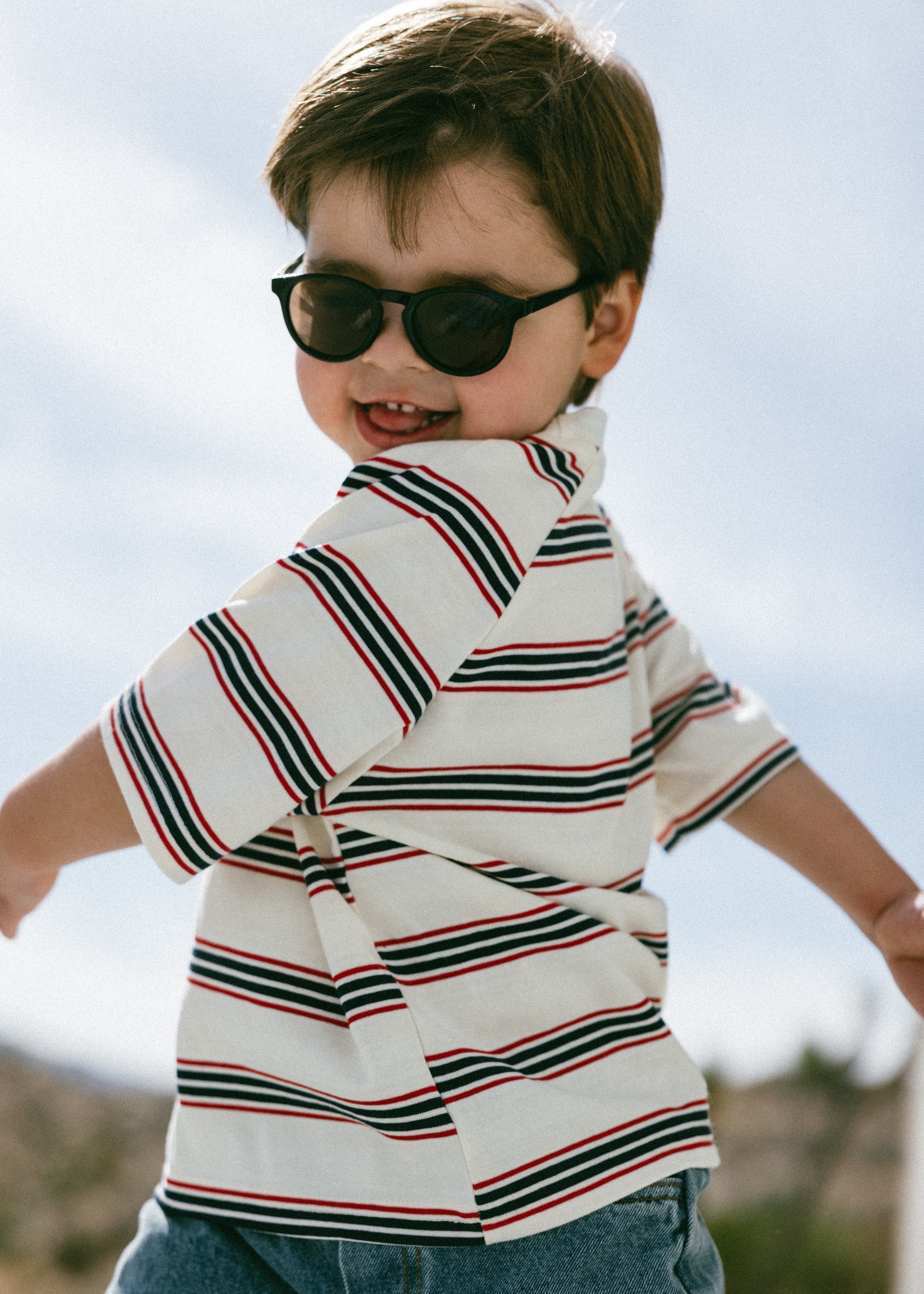 • Ivory shirt with horizontal navy and red stripes