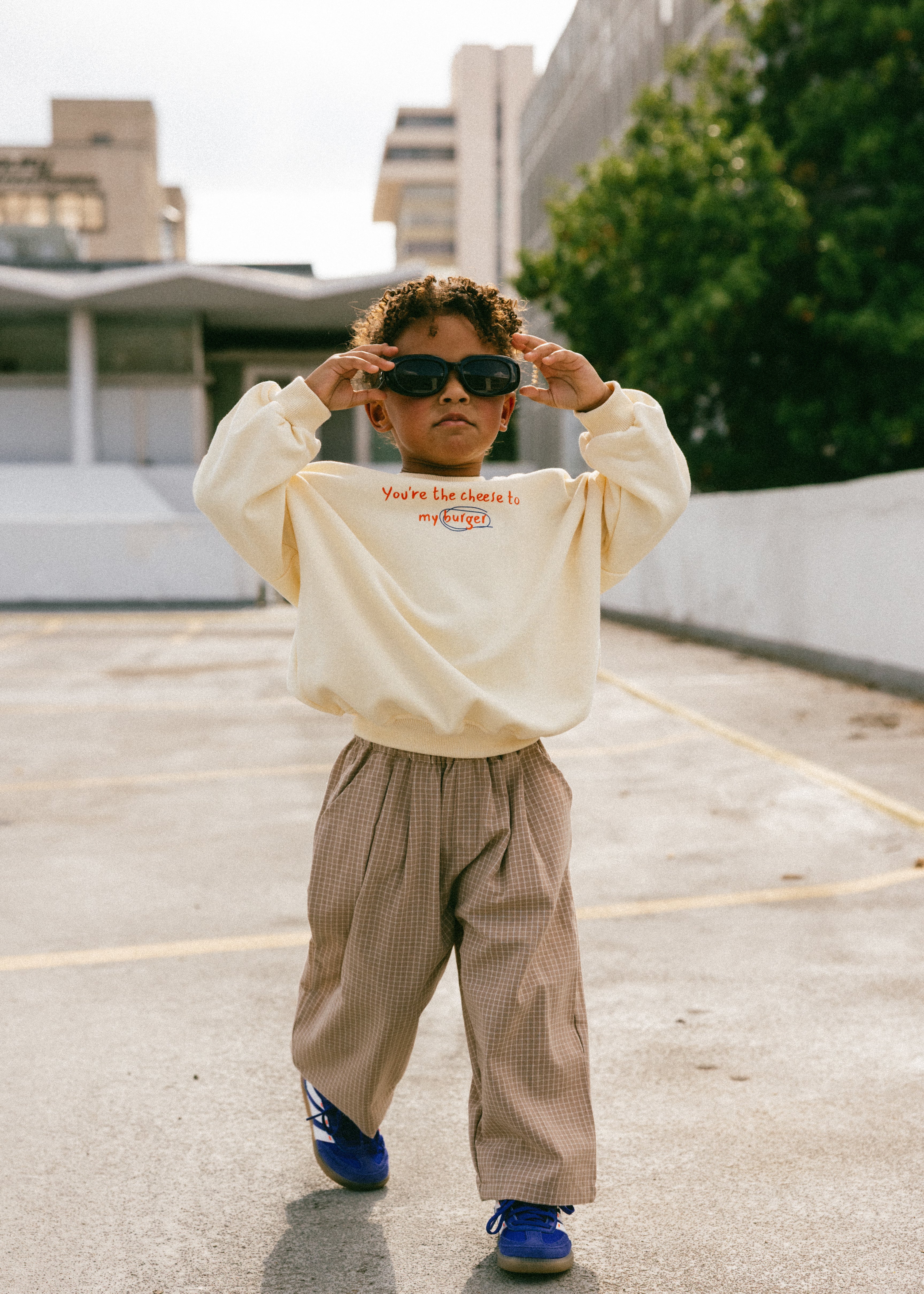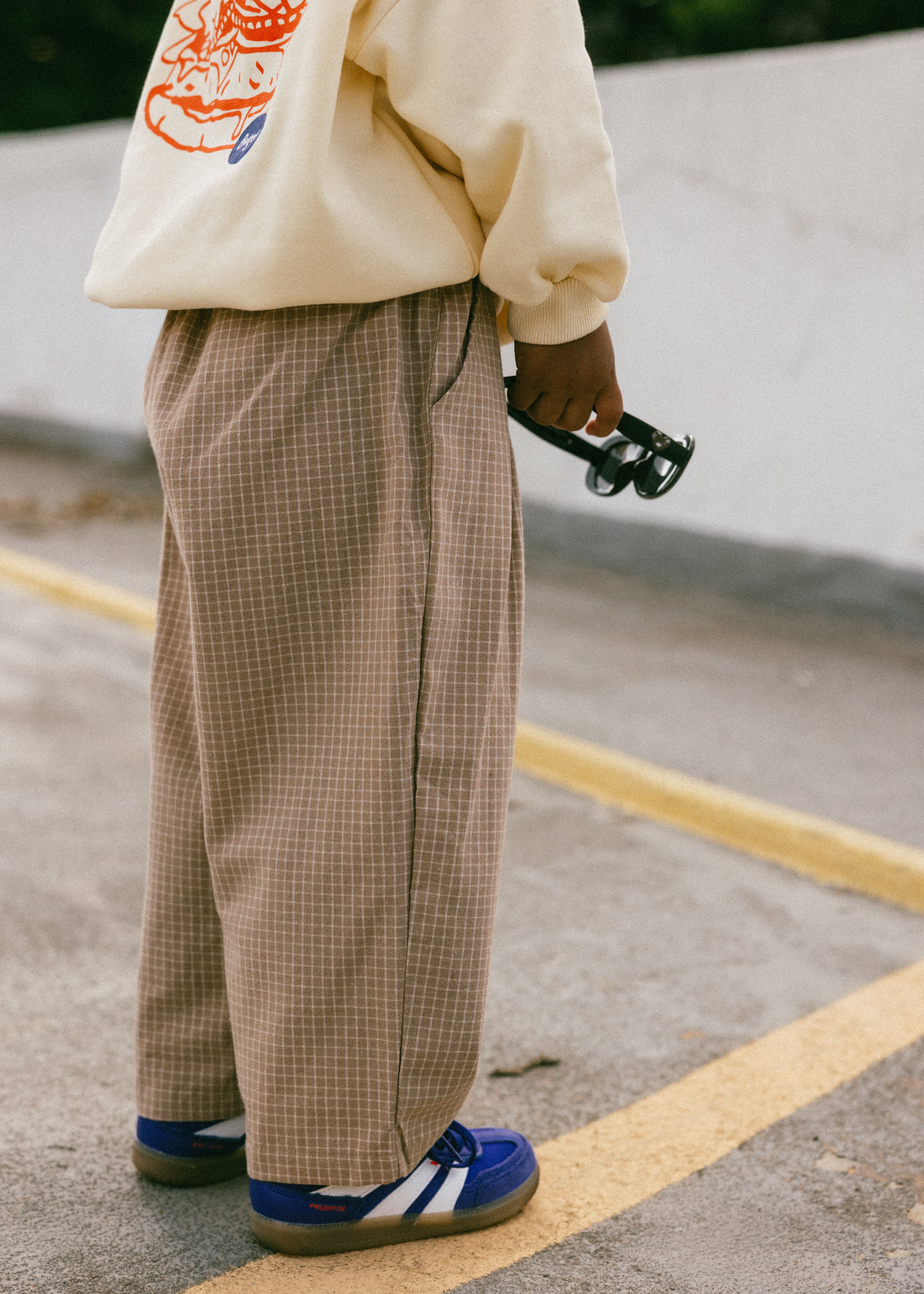• Khaki colored pants with white colored grid