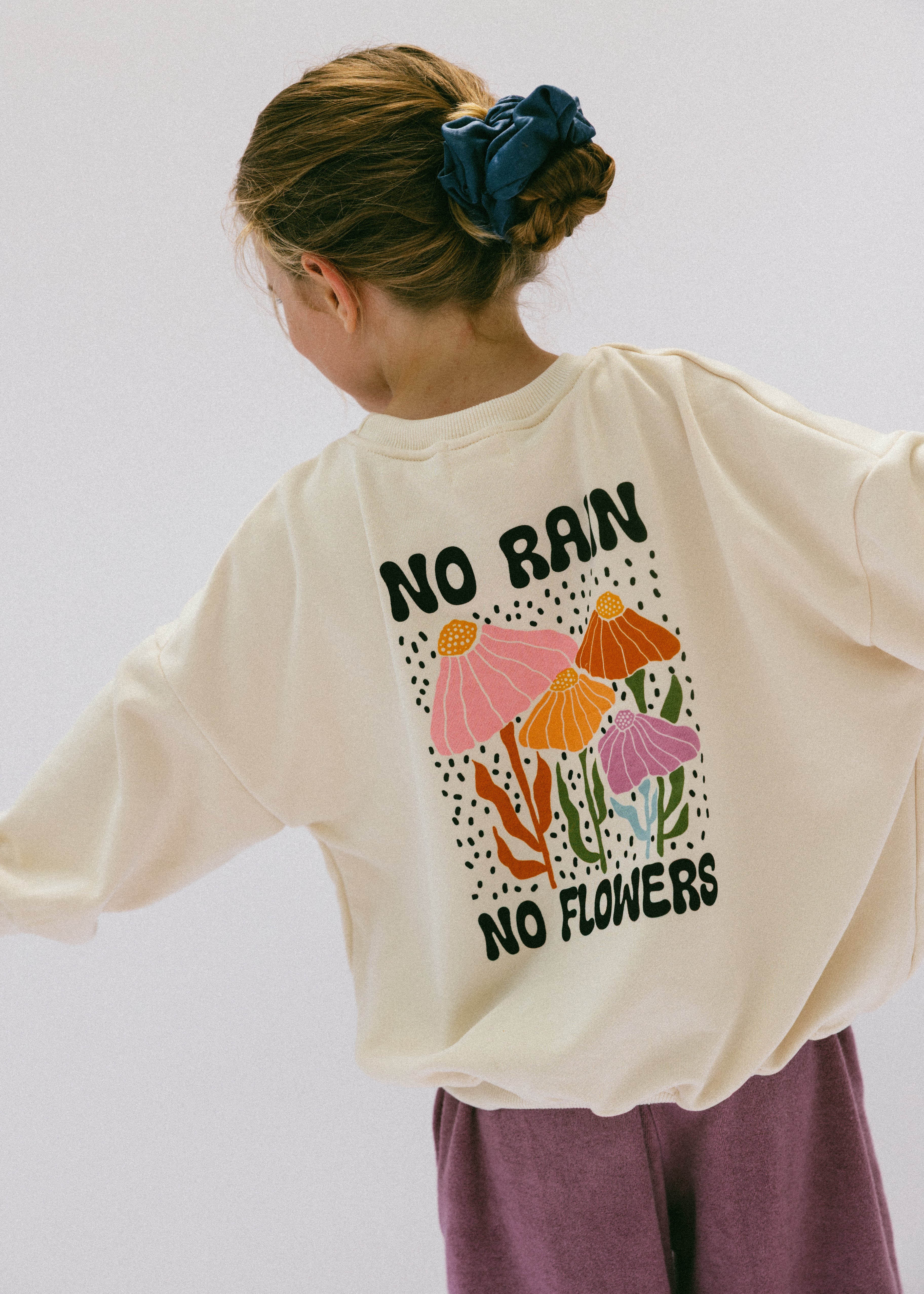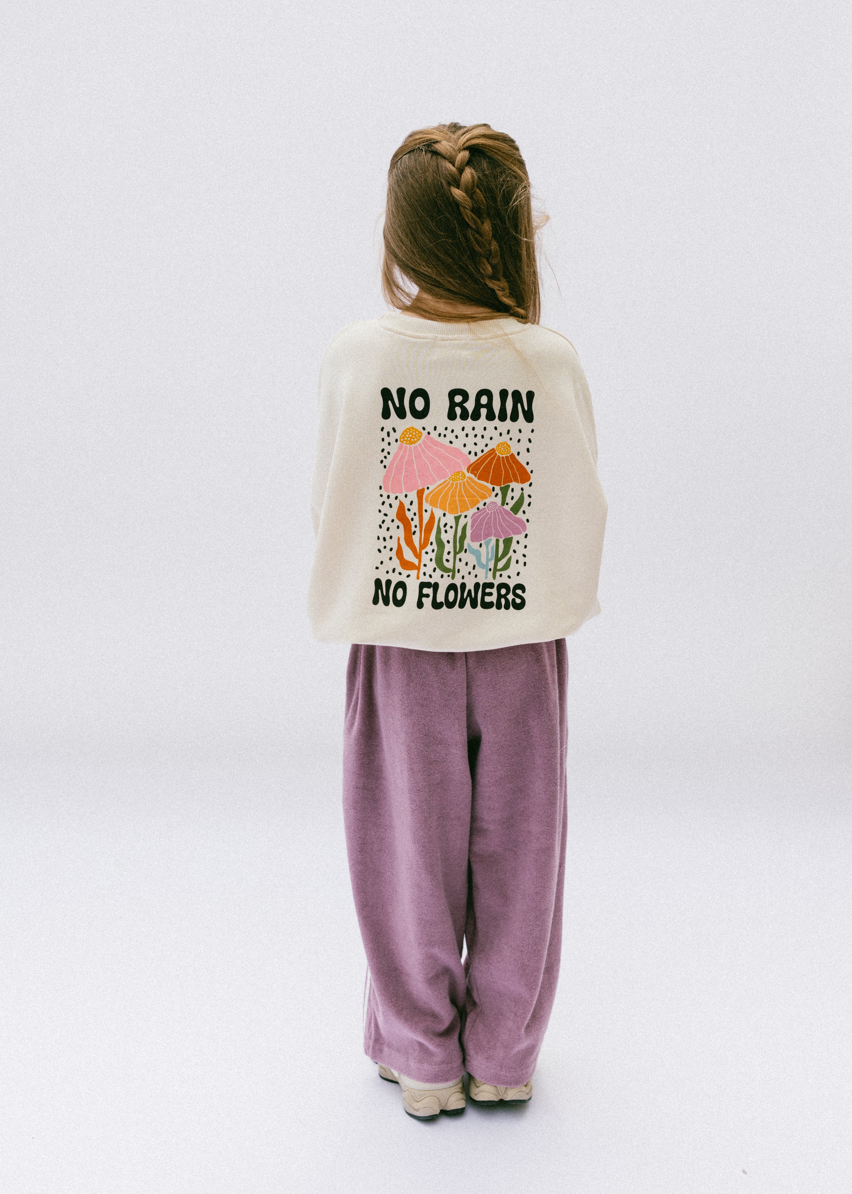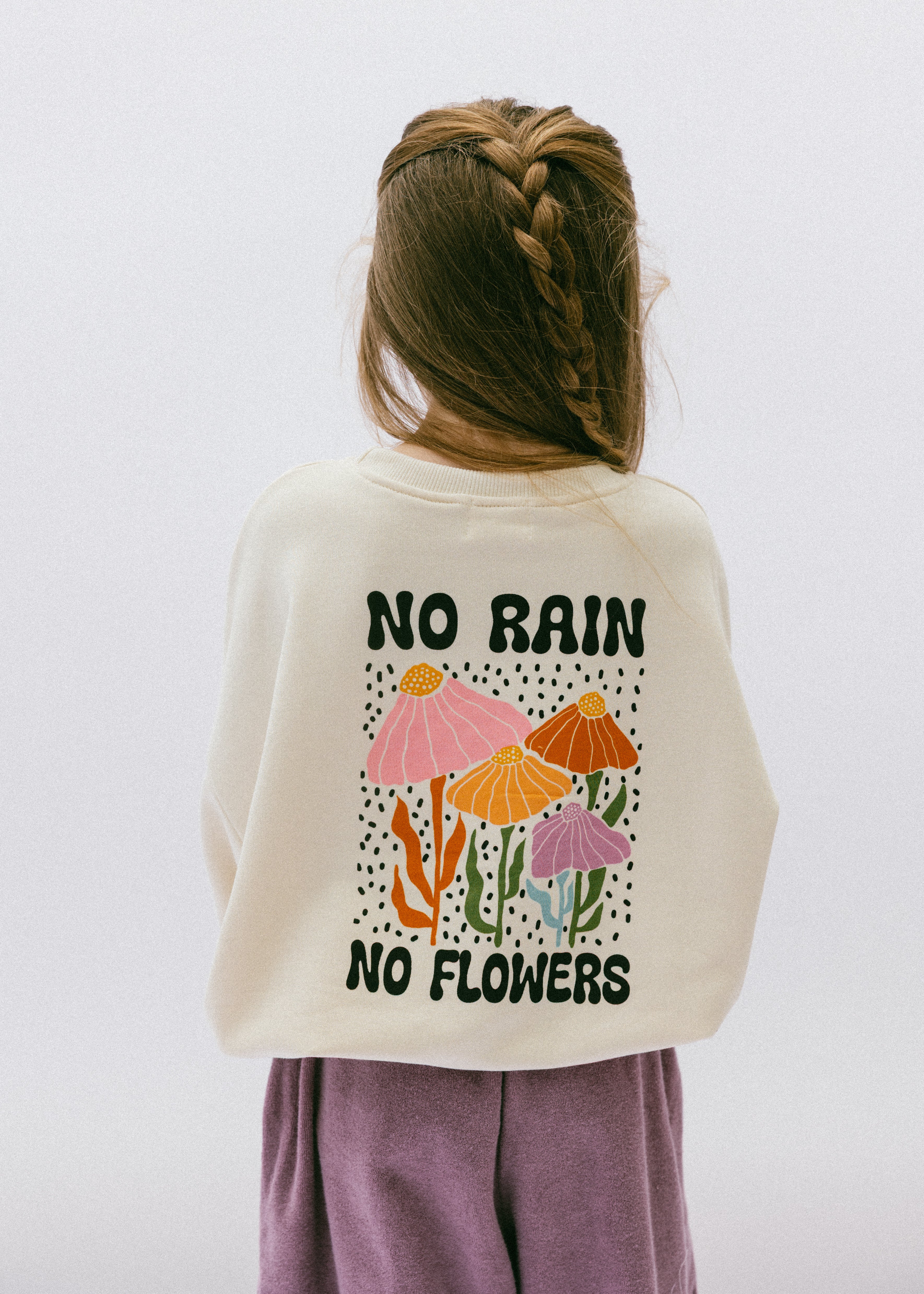 • Back floral graphic: “No rain-no flowers” in black lettering with flower graphic