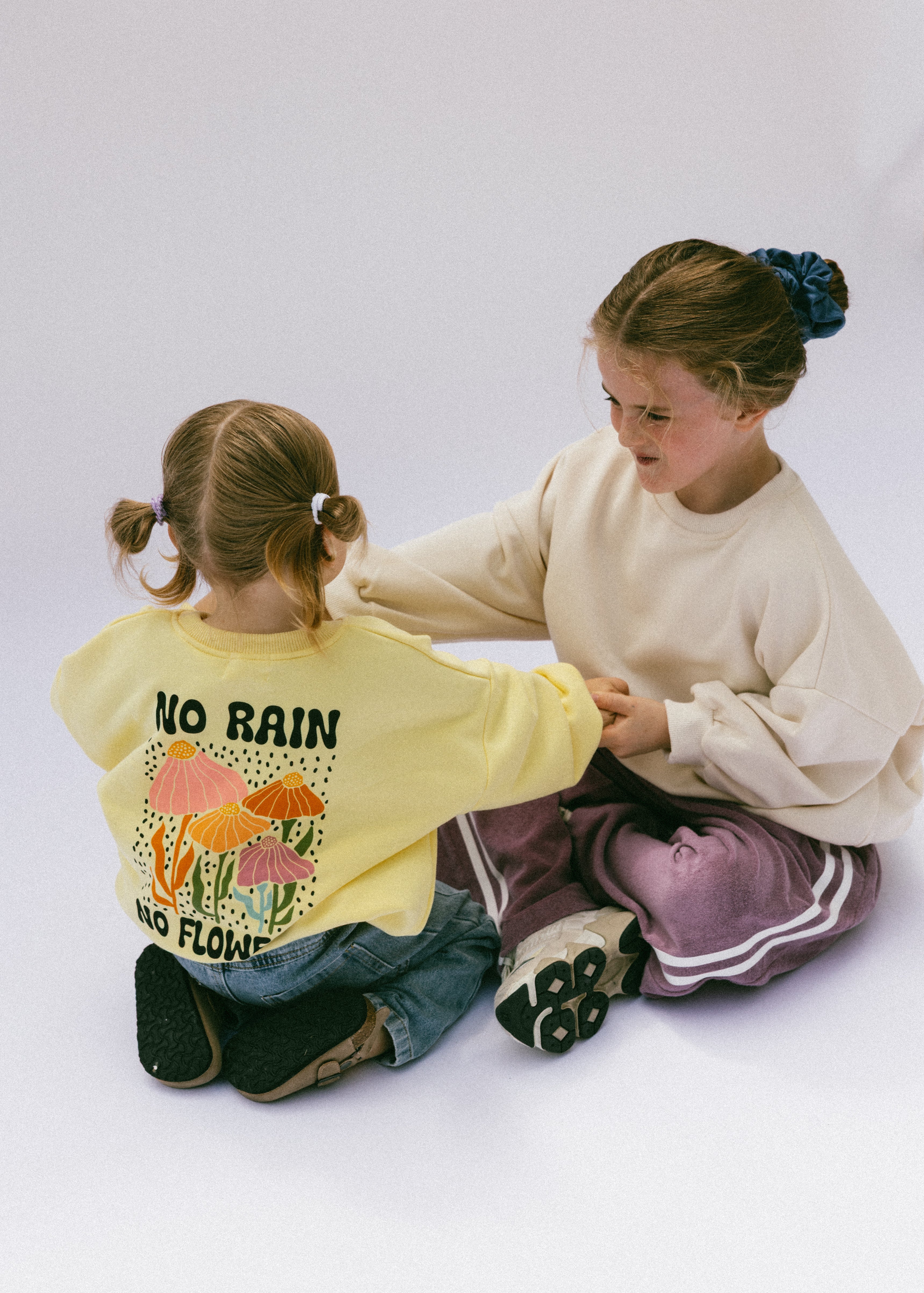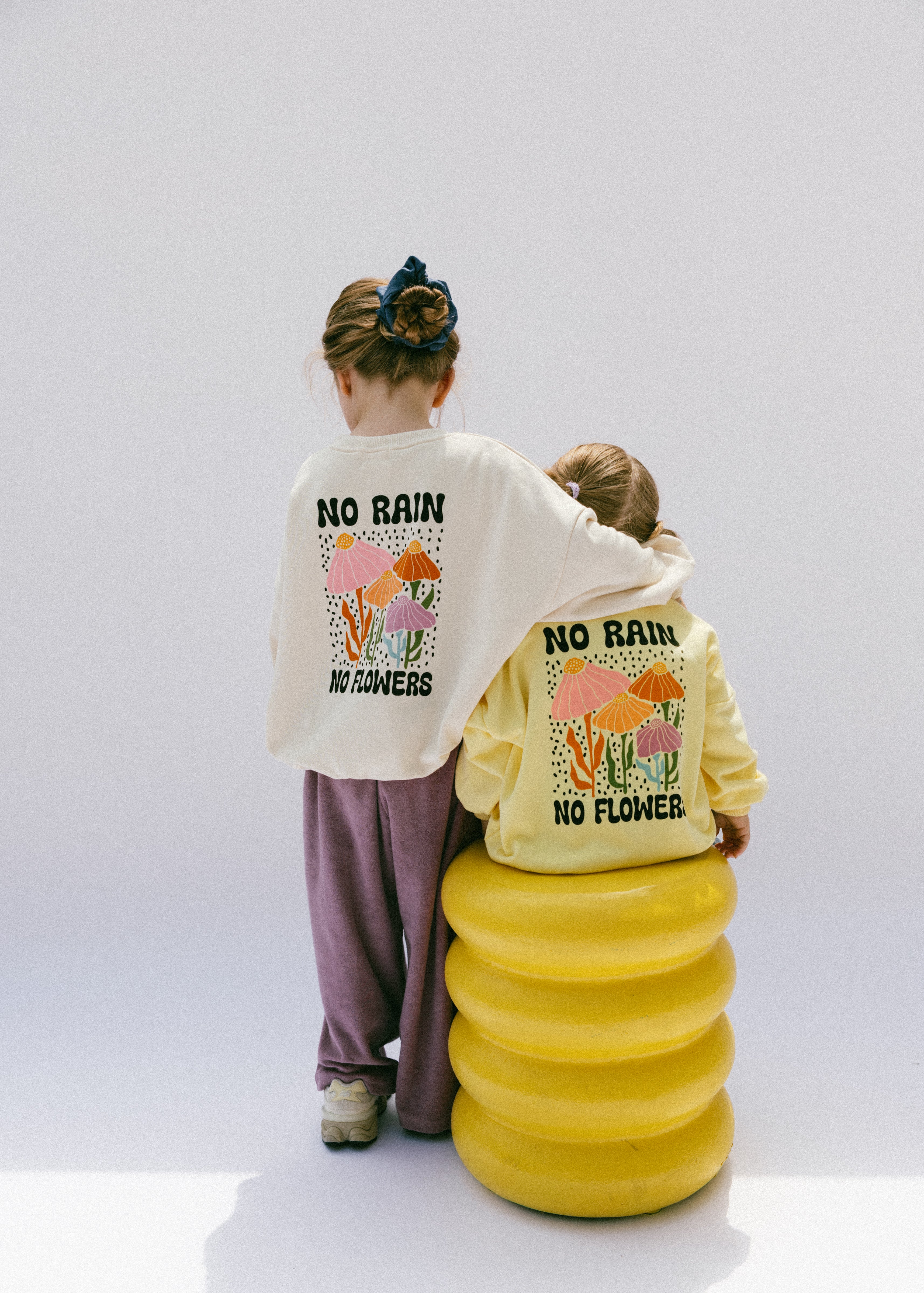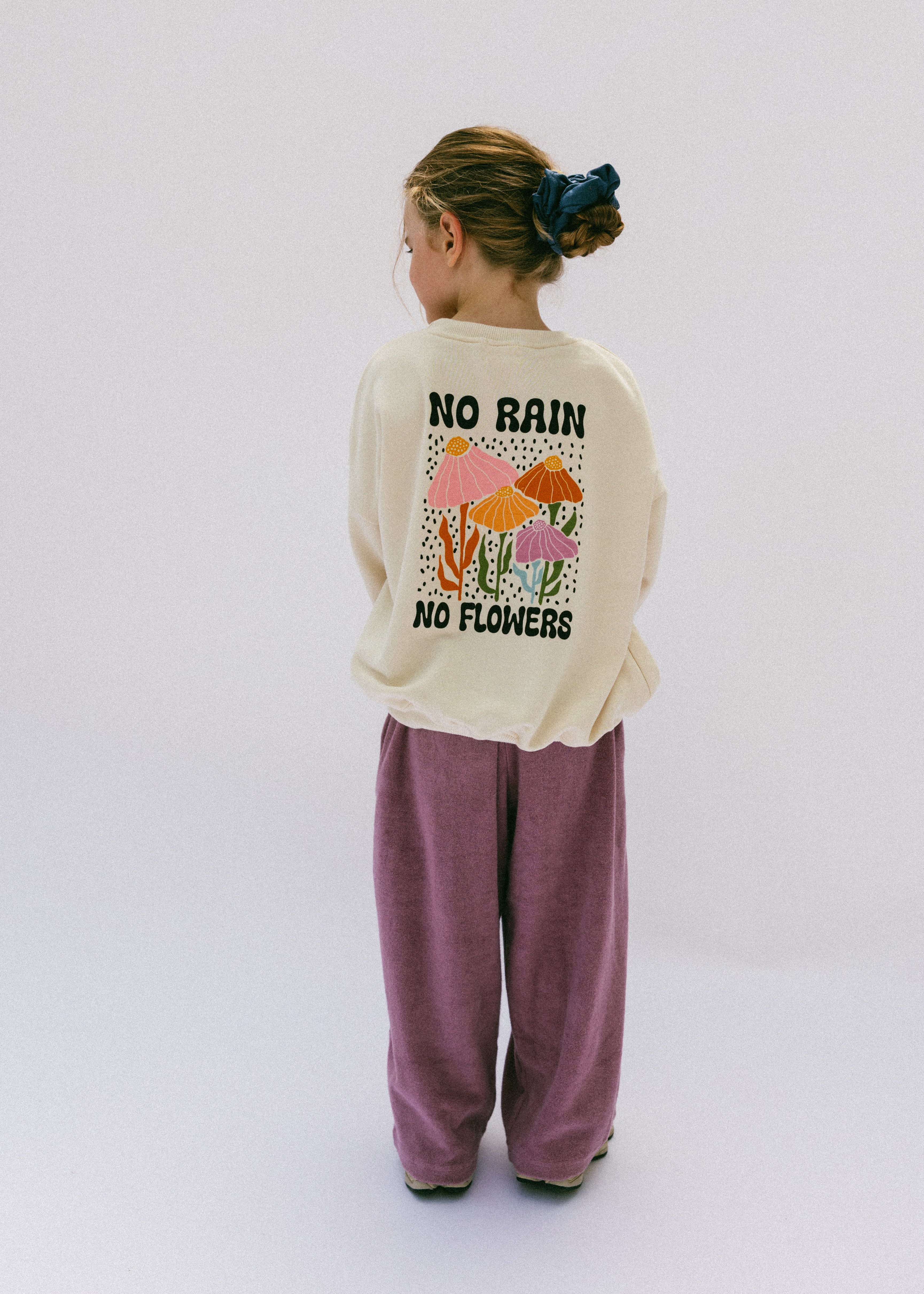 • Back floral graphic: “No rain-no flowers” in black lettering with flower graphic