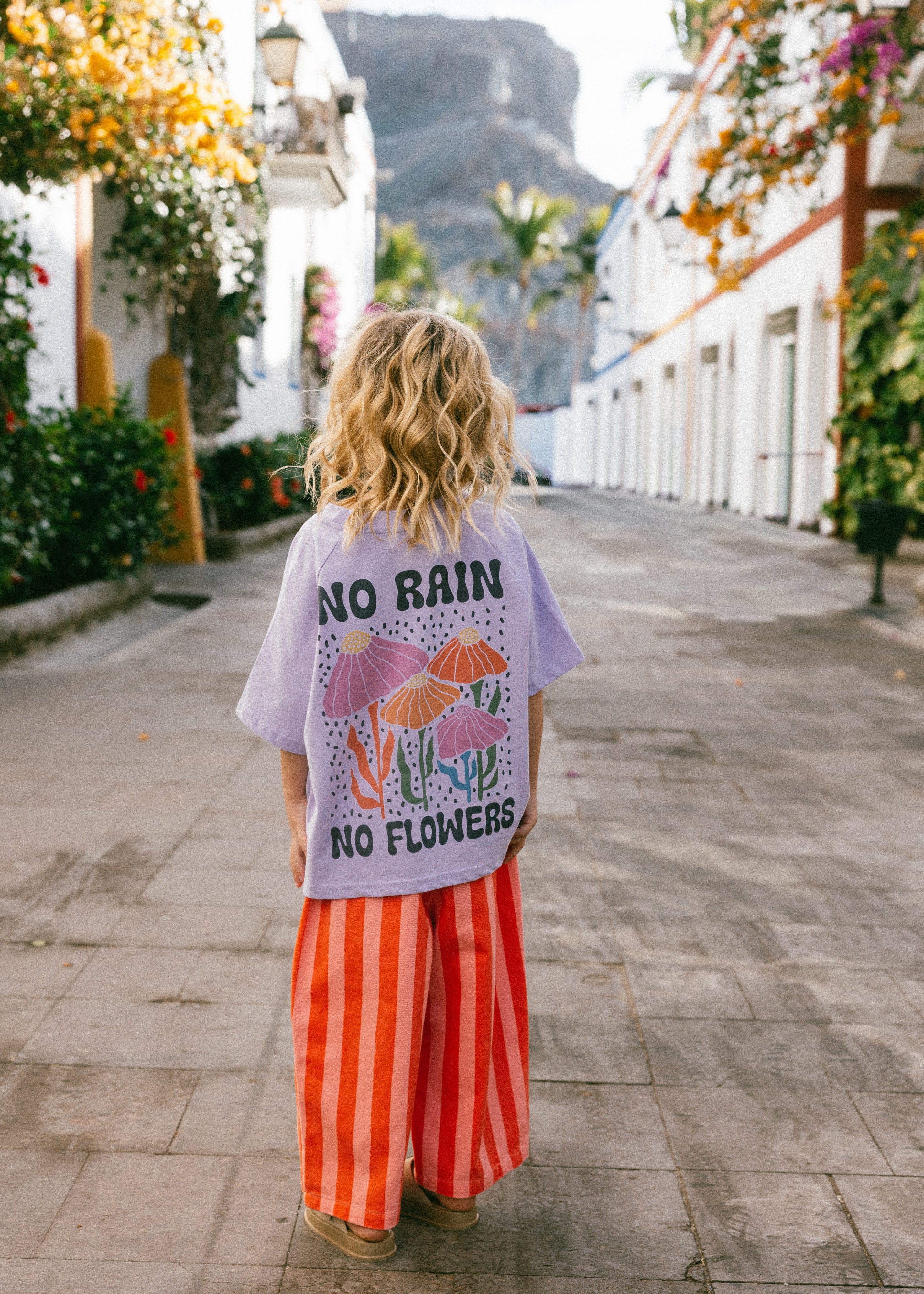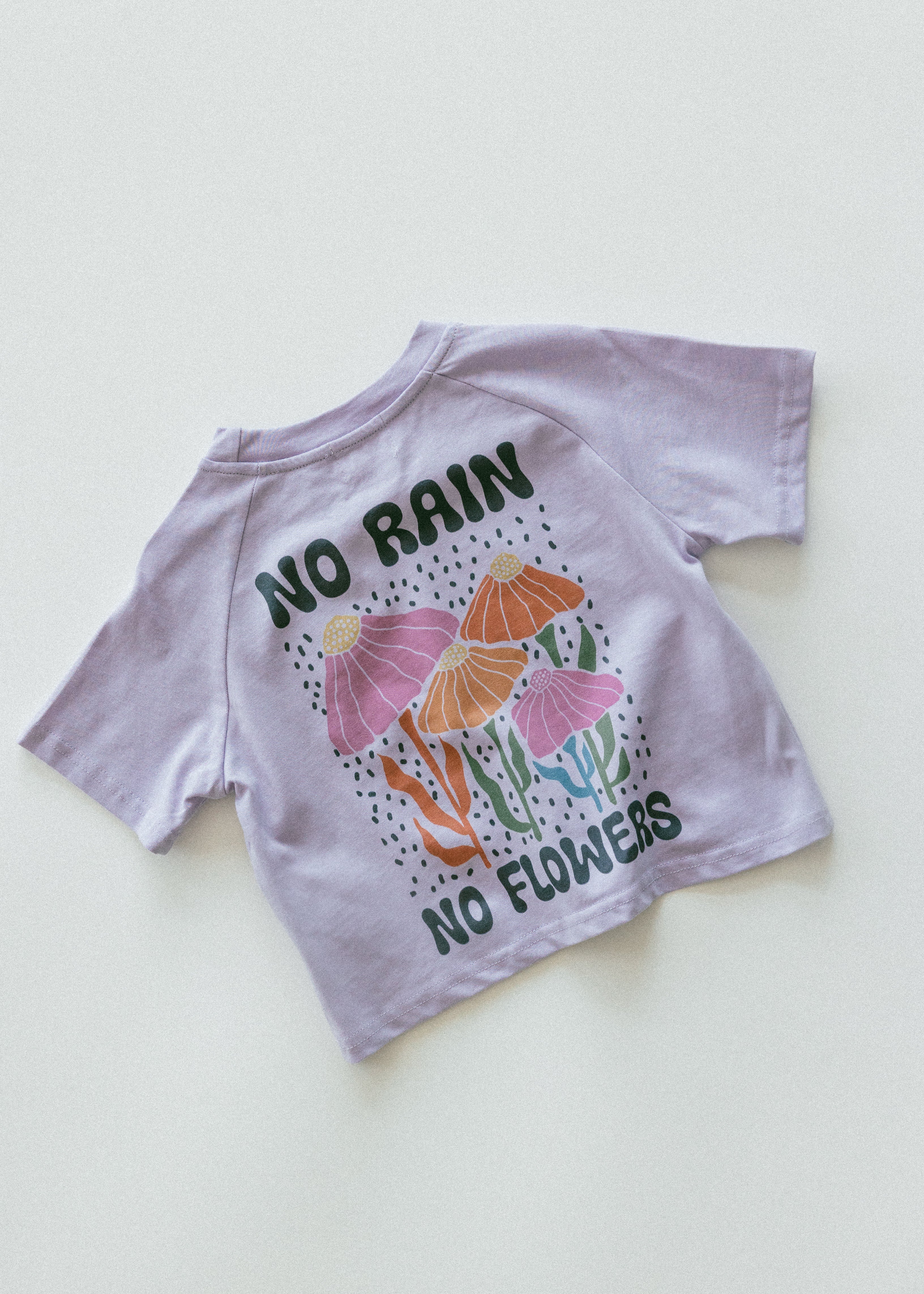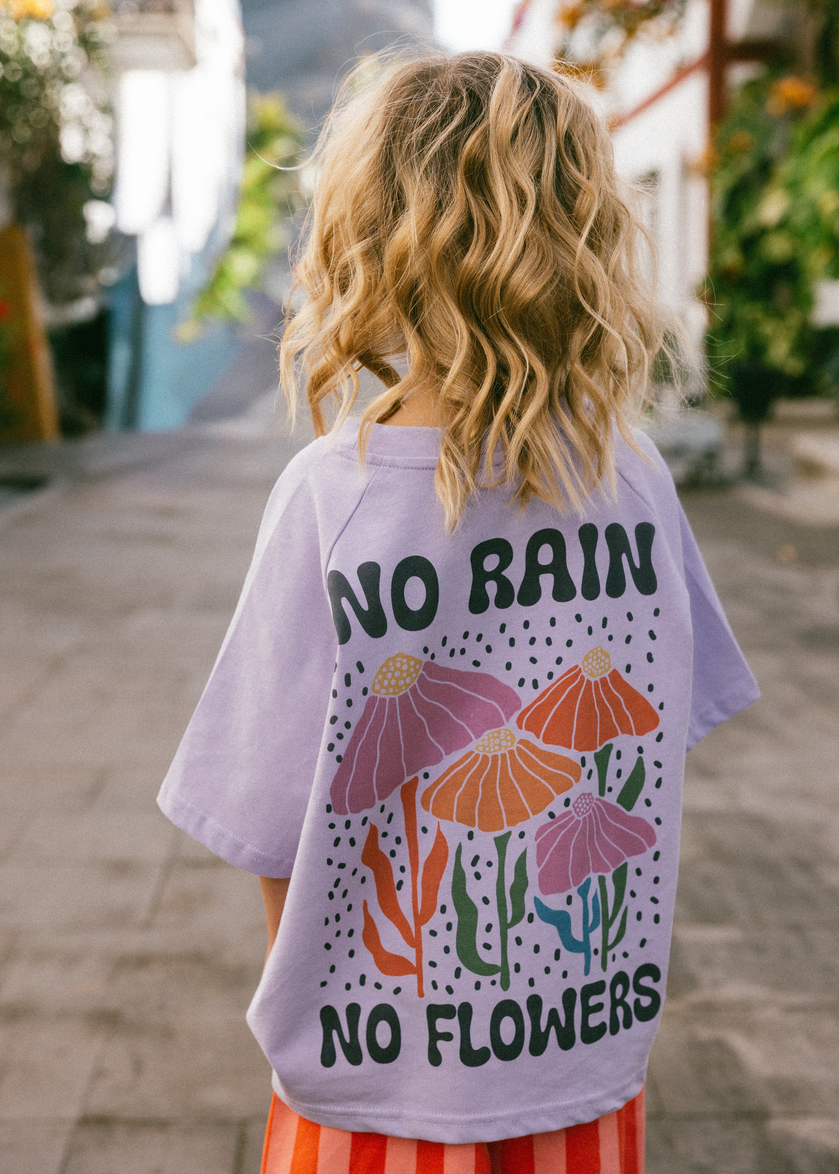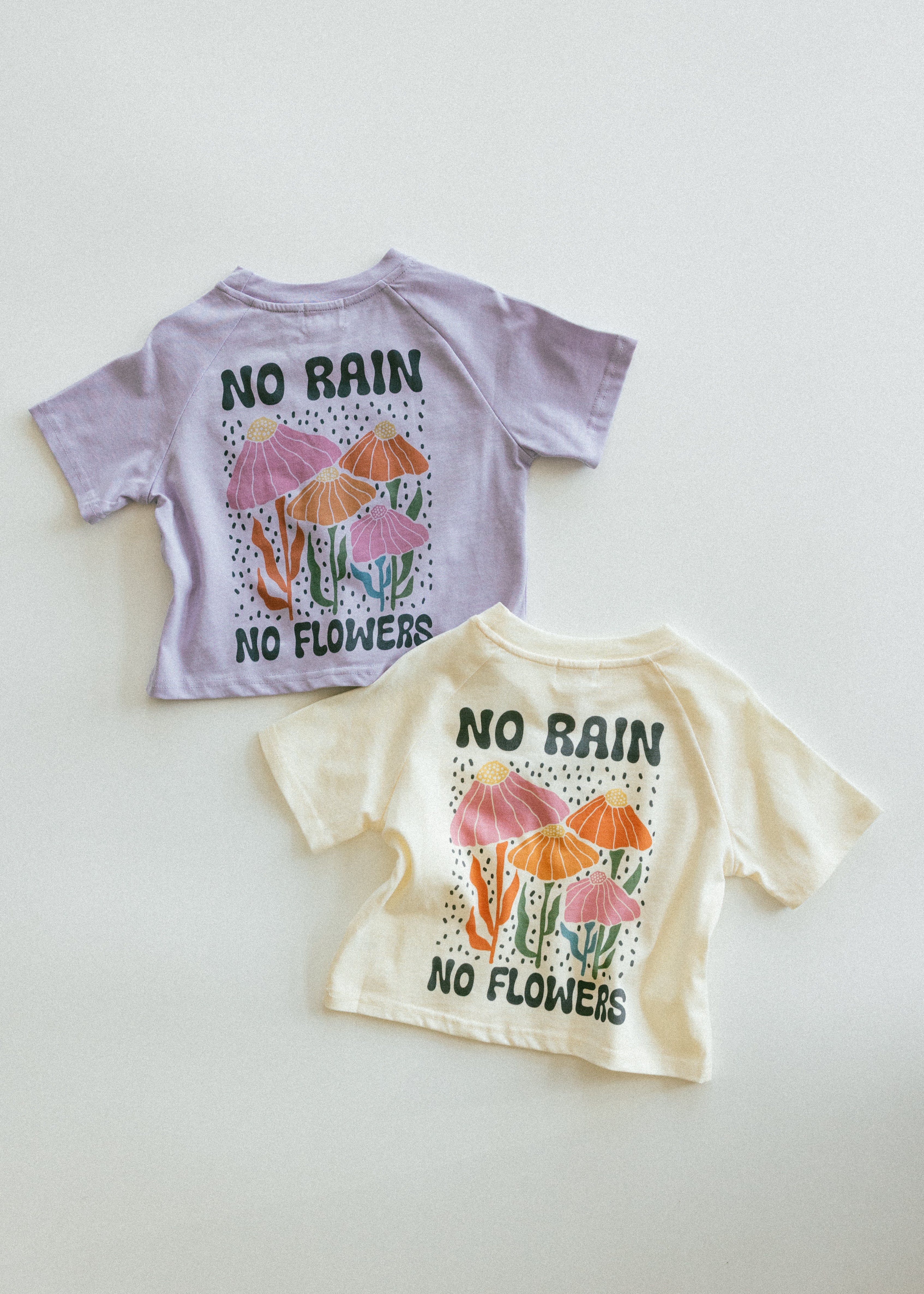 • Back floral graphic: “No rain-no flowers” in dark gray lettering with flower graphic